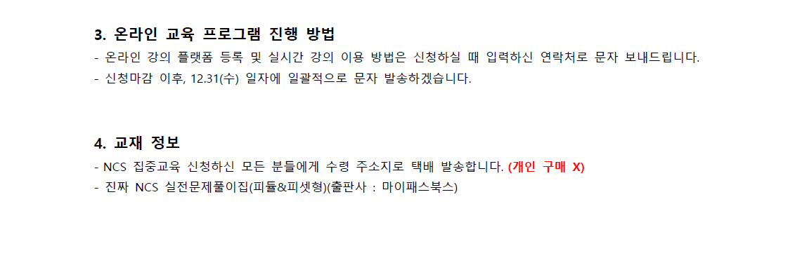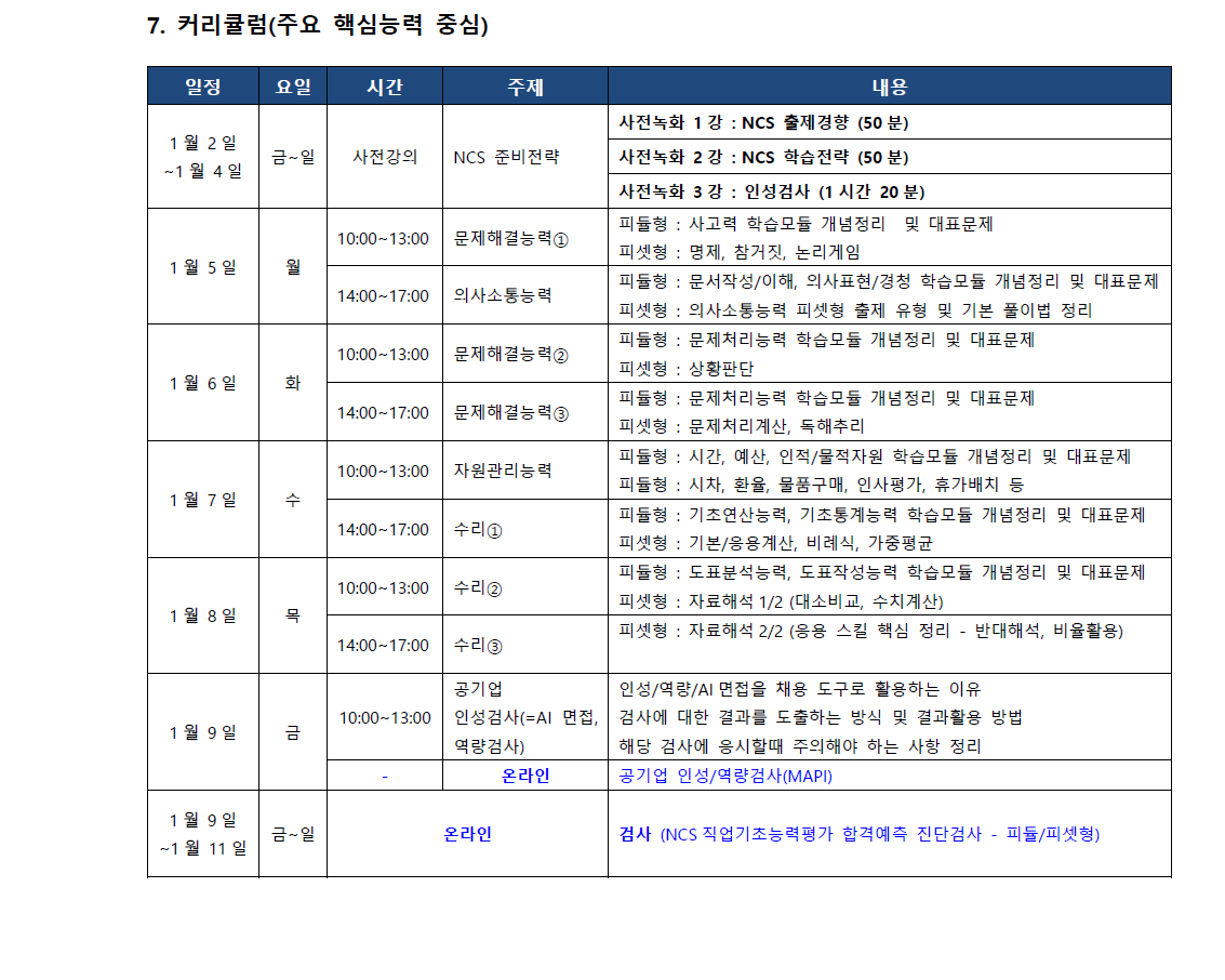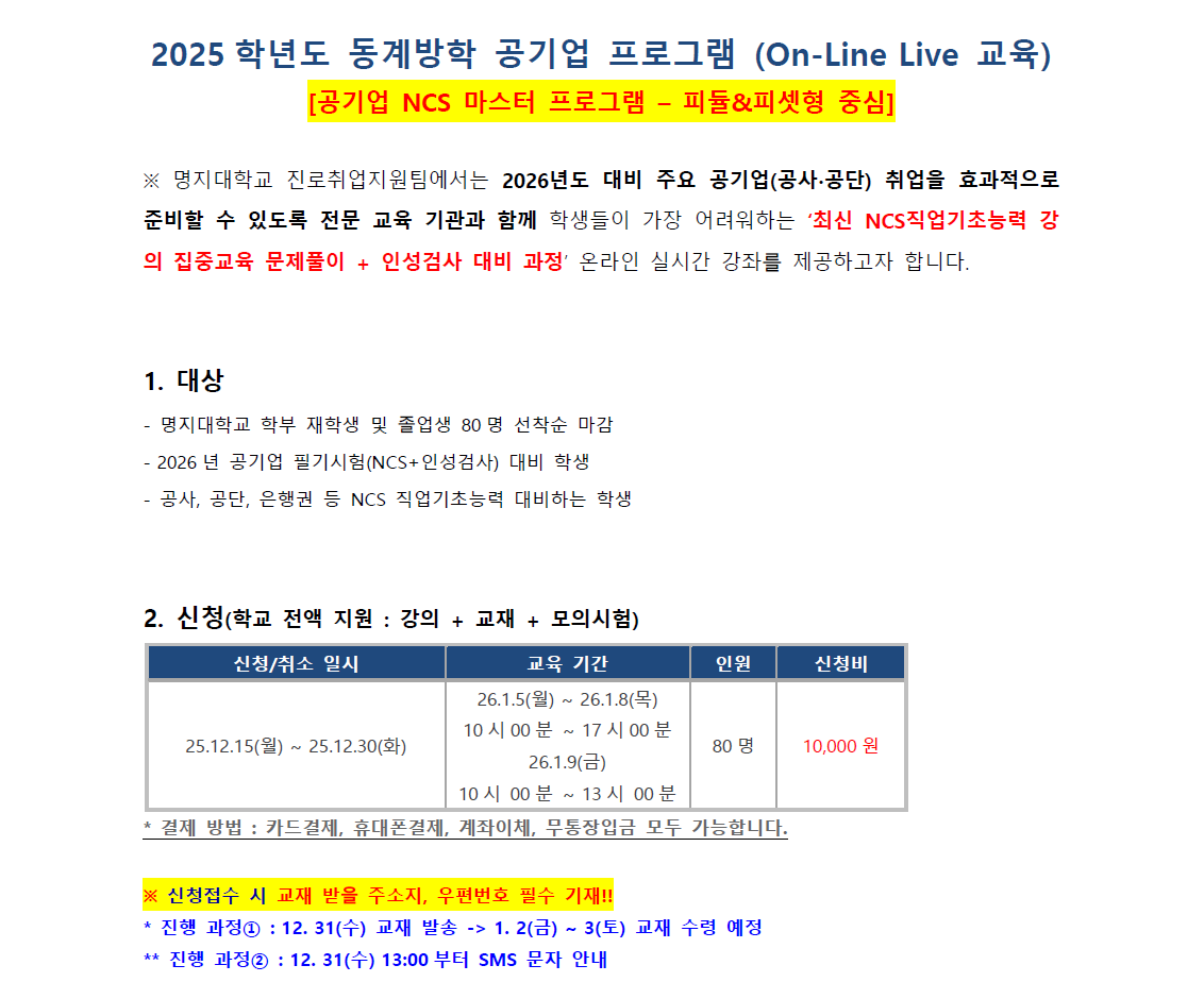 교육안내 상세보기 NCS 대학교육 공유 페이스북 트위터 카카오 현재 URL을 Clipboard에 복사하기 학번전공계열 명지대학교 2025학년도 동계방학 공기업 NCS 마스터 프로그램(문제풀이+인성검사) 접수기간 12/15(월) ~ 12/30(화) 23:59 인원 80명 장소 대상자 명지대학교 재학생 및 졸업생 행사일시 1.5(월)~1.9(금) 수강료 10,000원 이전 수강신청